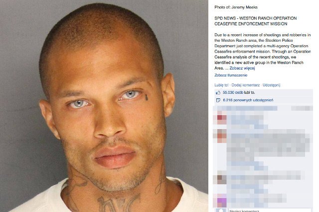 W minioną środę policjanci z kalifornijskiego miasta Stockton zatrzymali 30-letniego Jeremy’ego Meeksa. Jednego z najbrutalniejszych przestępców w regionie. Chwaląc się swoim sukcesem, funkcjonariusze umieścili na Facebooku zdjęcia zatrzymanych. Zwykle na takie fotografie nikt nie zwraca uwago, ale tym razem było inaczej, bowiem Meeks bardzo... spodobał się amerykańskim internautkom. W ciągu dwóch dni zdjęcie Meeksa doczekało się ponad 55 tys. polubień.