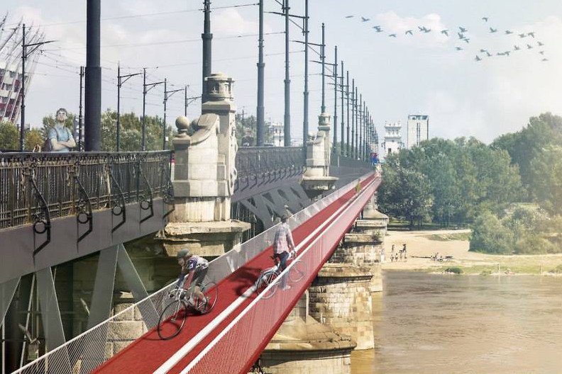 Proponujemy wykorzystanie istniejącej struktury nośnej mostu i podwieszenie poniżej niego kładki rowerowej o szerokości 3 metrów za pomocą lekkiej struktury stalowej. Przewidywana wartość inwestycji jest ułamkiem kosztów, które miasto musiałoby ponieść, aby stworzyć nową, samonośną przeprawę pieszo-rowerową przez Wisłę. Lokalizacja kładki rowerowej poniżej poziomu jezdni dodatkowo separuje jej użytkowników od hałasu komunikacyjnego, daje bliższy kontakt z Wisłą, a także pozwala spojrzeć na zabytkową konstrukcję mostu z niespotykanej perspektywy.