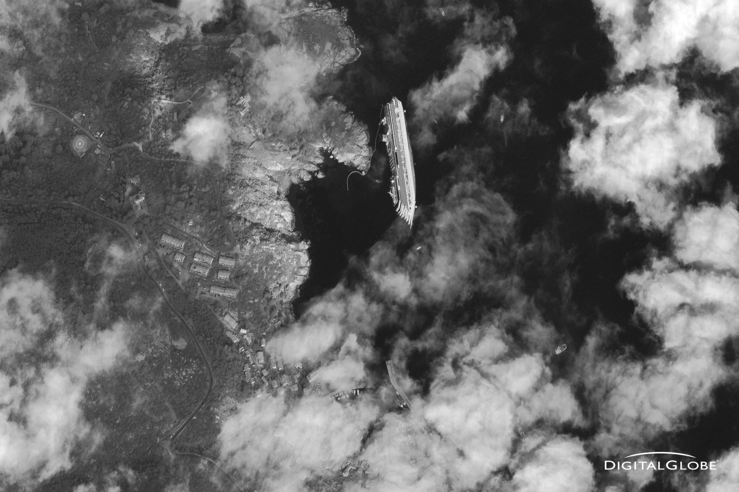 Zdjęcie wraku zrobiono z satelity 17 stycznia 2012 roku. Statek leży na półce skalnej, pod którą znajduje się głęboki na kilkadziesiąt metrów rów. Niedługo statek może się zsunąć.