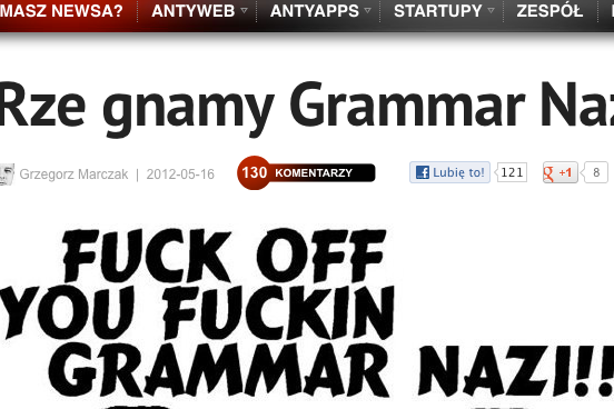 Pisać z błędami nie tylko nie wolno, ale przede wszystkim nie wypada. Zwłaszcza dziennikarzom. Wiadomo jednak, że mała pomyłka może się zdarzyć się każdemu. Wtedy na miejscu są już "gramatyczni naziści". Nie ma znaczenia, czy chodzi o jedną literówkę, brak przecinka i kropki czy rażącego ortografa. W komentarzach pod tekstem zaczyna się jatka i konkurs na to, kto znajdzie więcej błędów oraz lepiej ośmieszy autora. Teraz twórca bloga AntyWeb postanowił ukrócić ich panowanie. W rozmowie z naTemat, Grzegorz Marczak wyjaśnia, kim są "gramatyczni naziści" i czemu trzeba z nimi walczyć.