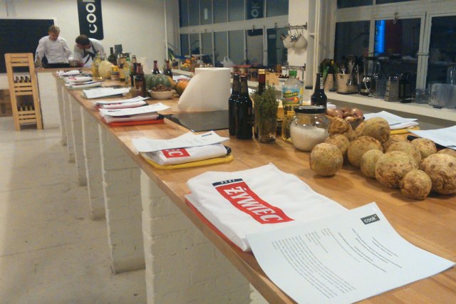 No więc gotowaliśmy kasztany w piwie Bock, grupa obok ma bazie Portera ważyła sos do polików. Zapachy, jakie zaczęły rozchodzić się po CookUp Studio, kiedy odpaliliśmy pierwsze palniki były więc naładowane „lotnymi” procentami, no i co tu dużo mówić – nieziemskie. Pomimo moich początkowych obaw, że w kuchennym amoku zaczniemy tracić kontrolę nad nożami, każdy w skupieniu pracował przy swojej stacji, umiejscowionej na przestronnej kuchennej „wyspie”. Wszystkie produkty mieliśmy w zasięgu widelca czy łyżki, a cięższe sprzęty – garnki, patelnie czy miksery – w odległości kilku kroków.