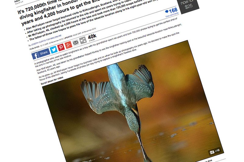 Po latach zakradania się w krzakach Alan McFayden, szkocki fotograf, dopiął swego. Przez cały ten czas zależało mu tylko na jednym. Chciał zrobić zdjęcie ptaka, który nurkuje do wody. Nie byle jakie zdjęcie, to byłoby przecież proste. Miało być idealne. – Zależało mi na perfekcyjnym nurkowaniu, nieskazitelnie prostym, bez plusków. Ptak musiał być w idealnej pozycji, ale ja też musiałem się w takiej znajdować – opowiadał McFayden lokalnym dziennikarzom.