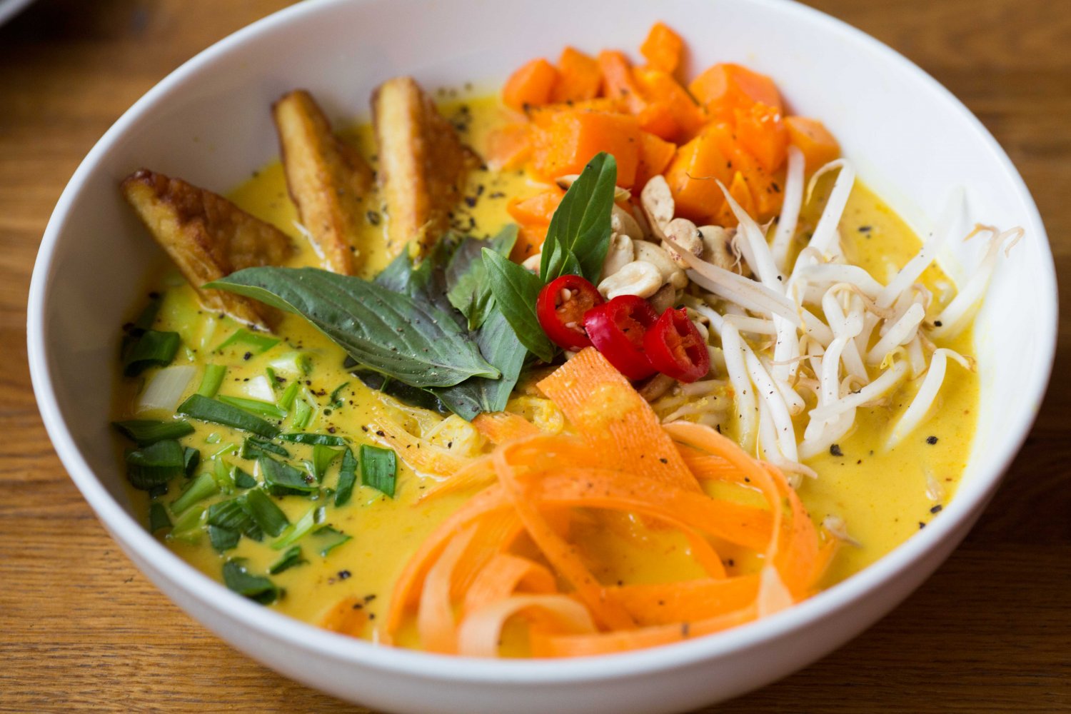 W karcie znajdziecie zarówno dania wegańskie, jak i wegetariańskie. Nie jest długa, za to zmienna, co zawsze się chwali. Oszaleć można już na punkcie przystawek, np. Gua Bao – orkiszowej bułeczki przełożonej sosem orzechowym, tofu, boczniakiem i chutneyem z cebulki. Szczerze mówiąc, jest to tak sycące, że w zasadzie można by na tym poprzestać. Ale szkoda by było nie spróbować doskonałych zup, zwłaszcza Laksy – kremowej, kolorowej słodko-kwaśnej i megadobrej! W środku znajdziecie pieczoną dynię, tofu, uprażone orzeszki ziemne, tajską bazylię, kiełki. Jak mówi Michał – sztos! Potwierdzam. Przybywajcie! Przyjmują tu wszystkich, niemal bez pukania…