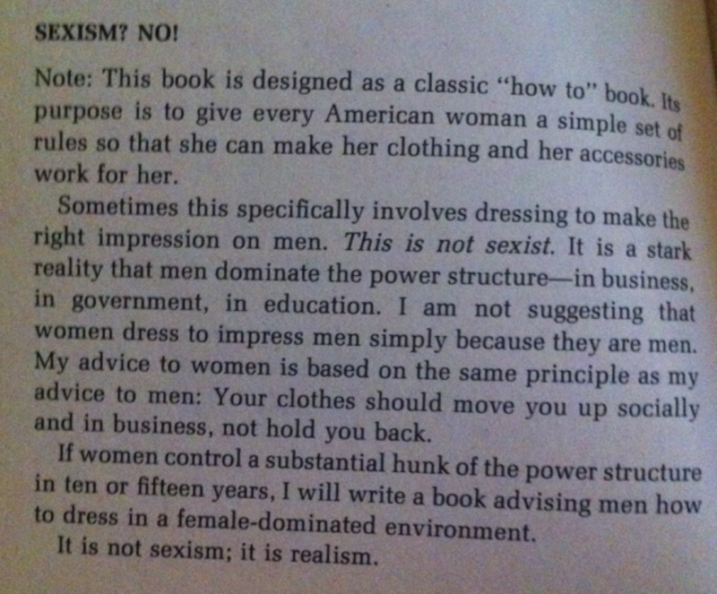 Jednym z założeń strategii [opisywanej w książce – red.] jest wywarcie właściwego wrażenia na mężczyznach. Mówiąc to, nie chcę zabrzmieć seksistowsko. Prawda jest jednak taka, że to mężczyźni dominują w strukturach władzy zarówno w rządzie, biznesie, jak i edukacji. Jeśli za 15 lat sytuacja się zmieni i to kobiety będą trzymać władzę – napiszę poradnik dla mężczyzn, o tym jak mają ubierać się w środowisku zdominowanym przez kobiety.