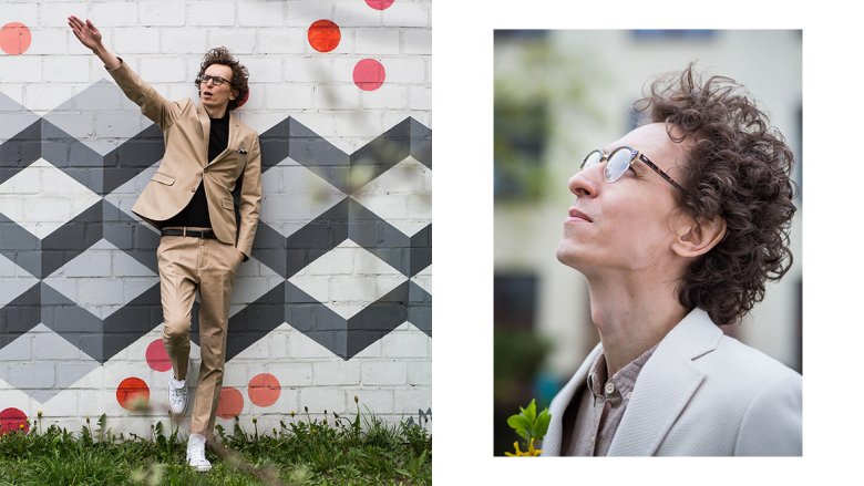 Na zdjęciu po lewej stronie: marynarka - TK MAXX, koszula i pasek - H&M, buty - Kazar, okulary - Ray Ban. Na zdjęciu po prawej stronie: garnitur i poszetka - H&M; pasek - TK MAXX; koszulka - Zara; trampki - Converse/Heavy Duty