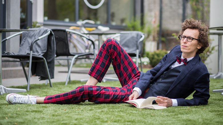 Na zdjęciu: marynarka i koszula - Vistula, kamizelka - Van Graaf, mucha i spodnie - proj. stylistki, trampki - Converse/Heavy Duty, książka - "Czas Kaczyńskiego. Polityka jako wieczny konflikt” Krasowski Robert