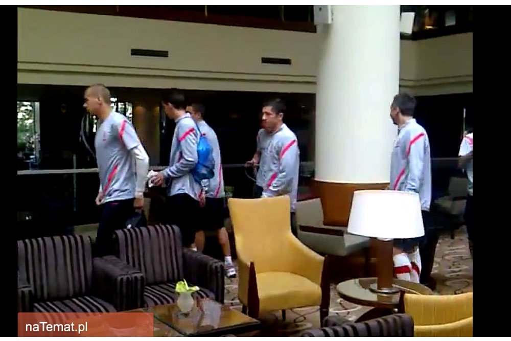 Dostaliśmy dwa filmy nakręcone popołudniu. Reprezentacja Polski zbiera się w lobby hotelu Hyatt, by wsiąść w autobus i wyjechać na ostatni trening przed meczem z Grecją. Widać że humory dopisują, widać że nastrój w kadrze jest dobry. Widać, że stres reprezentantów nie zżera. A to dobrze!