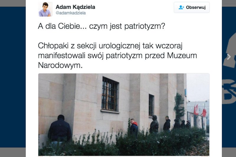 Niektórzy dopytują, kim są młodzieńcy, którzy nie mogąc znaleźć toalety zdecydowali się oddać mocz na Muzeum Narodowe. – Skąd wiesz, że to nie KOD-owcy? – dopytują. Fakty są jednak takie, że Muzeum Narodowe znajdowało się w pobliżu marszu narodowców. Jedno jest pewne - nie miało to wiele wspólnego z patriotyzmem.