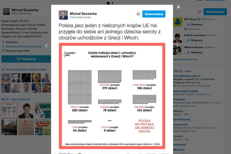 – Polska jako jeden z nielicznych krajów UE nie przyjęła do siebie ani jednego dziecka-sieroty z obozów uchodźców z Grecji i Włoch – napisał poseł Michał Szczerba, który zamieścił na Twitterze niechlubną, choć ważną dla Polaków grafikę.
