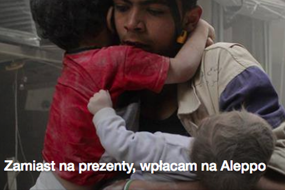 W akcję pomocy dla Syrii na Facebooku włączyło się już kilka tysięcy osób. Cel jest szczytny, a honorowa zasada brzmi: "Wciśnięcie przycisku "Wezmę udział/Going" jest publiczną deklaracją, że moja rodzina zrobi odpowiedni przelew do 24 grudnia". To nie jedyna inicjatywa wspierająca mieszkańców ogarniętej wojną Aleppo. I nie pierwsza wymyślona przez Polaków.