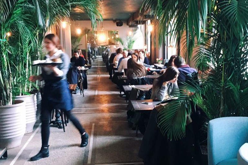 Honorowe miejsce zajmuje mosiężna palma, wykonana na specjalne zamówienie. Stojąca zaraz przy wejściu instalacja stanowi ciekawą przeciwwagę dla naturalnej zieleni żywej roślinności, w której wnętrze jest niemal skąpane. Dzięki temu, że gigantyczne okna w Palmierze ciągną się od podłogi do sufitu, wnętrze jest niesamowicie jasne - co służy zarówno roślinom, jak i entuzjastom Instagrama. W ciepły, słoneczny dzień dymnego błękitu filcowych siedzisk czy zieleni szlifowanych, labradorytowych blatów nie nie trzeba podkręcać żadnymi filtrami.