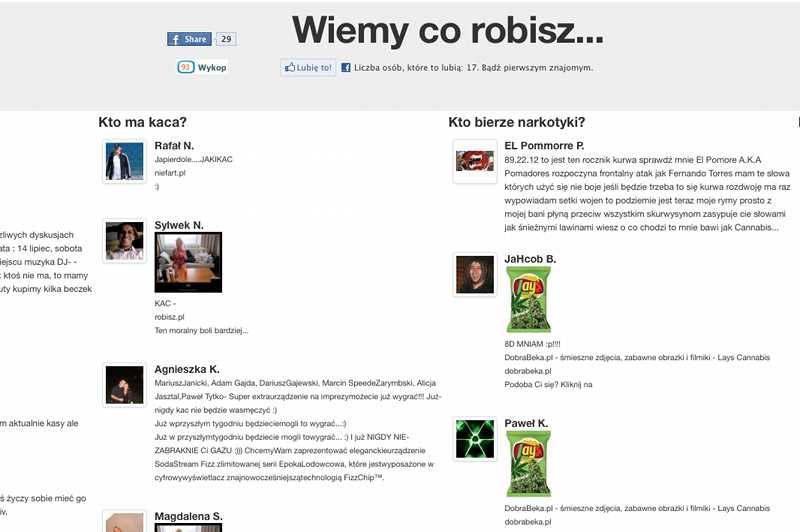 Podobnych relacji jest w internecie wiele. Sposobem piętnowania i ostrzegania przed "facebookowym ekshibicjonizmem" jest nie tylko narzekanie na forach internetowych. Młody programista Callum Haywood stworzył ostatnio stronę internetową "We Know What You're Doing", która gromadzi publicznie dostępne wpisy z Facebooka. W ślad za nim poszli polscy informatycy i tak powstał polski odpowiednik strony Calluma,wiemycorobisz.pl.
