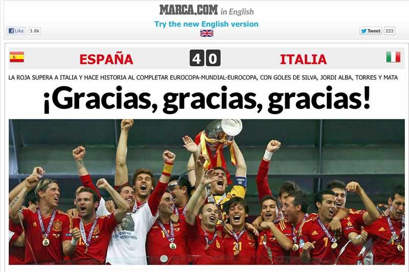 Hiszpańska prasa zachwyca się grą mistrzów Europy. "Dziękujemy, dziękujemy, dziękujemy!" - tytułuje swój artykuł "Marca". Dziennik pisze, że Włosi pewnie nigdy nie zapomną pierwszych 15. minut finałowego meczu w Kijowie. "El Pais" opisując drogę Hiszpanii do mistrzostwa zwraca uwagę na rolę Xaviego, rozgrywającego drużyny Vicente del Bosque. "Xavi po raz kolejny jak satelita pomiędzy Iniestą i Fabregasem kilkukrotnie umieszczał piłkę na orbicie pomiędzy defensywą Squadra Azzurra" - czytamy.