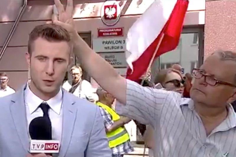Gdy reporter TVP Info próbował prowadzić relację spod gmachu Prokuratury Rejonowej na ul. Rakowieckiej w Warszawie, musiał wykazać się wielkim opanowaniem. Cały czas przeszkadzał mu jeden z ze zgromadzonych na placu mężczyzn, który za głową reportera wystawiał dwa palce układające się w literę V. W tym wypadku jednak był to popularny w szkołach podstawowych znak "diabełka", a nie symbol zwycięstwa spopularyzowany wiele lat temu przez premiera Wielkiej Brytanii Winstona Churchilla.