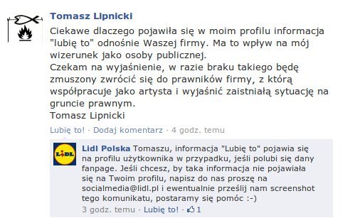 A więc nie tylko pożałował, ale jeszcze pogroził Lidlowi sądem. Jaka była reakcja oskarżonych? Jedyna możliwa. "Tomaszu, informacja: Lubię to, pojawia się na profilu użytkownika w przypadku, jeśli polubi się dany fanpage. Jeśli chcesz, by taka informacja nie pojawiała się na Twoim profilu, napisz do nas proszę (…) postaramy się pomóc" - odpowiedzieli w komentarzu.