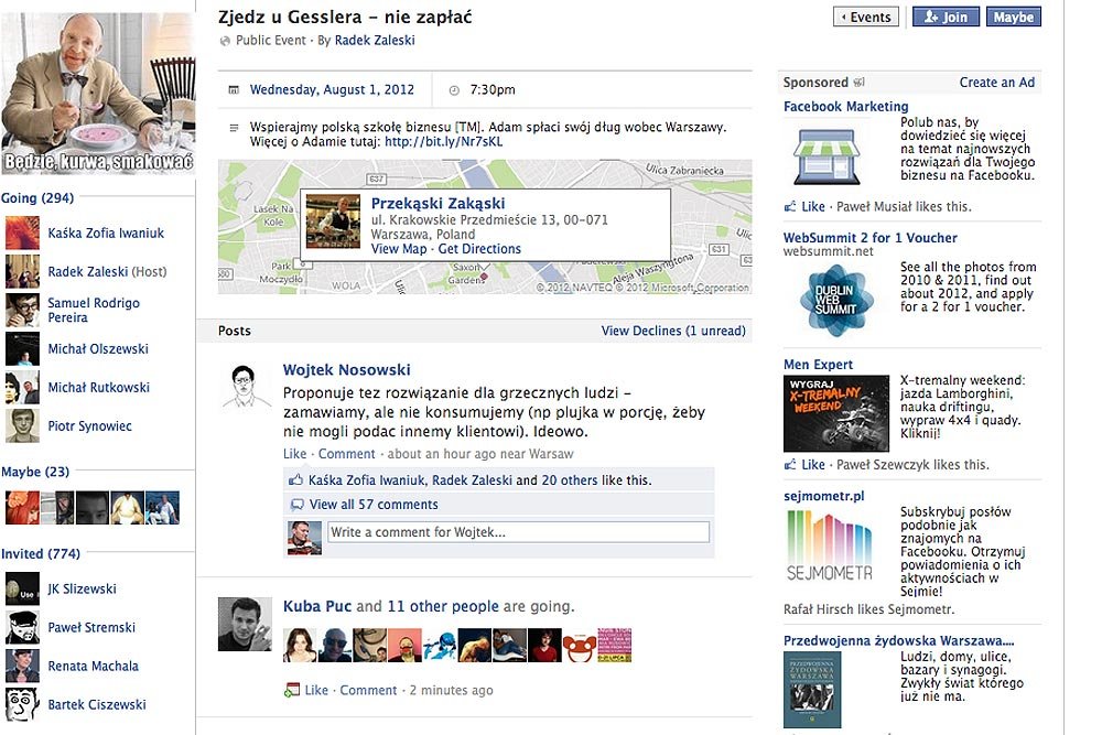Myśleliśmy dotąd, że Polacy nie lubią urzędników, lubią za to polską gospodarność w biznesie. Która, dodajmy, nie zawsze oznacza kryształową uczciwość. Przyznajemy - jesteśmy zaskoczeni. Na Facebooku nabiera bowiem tempa akcja "Zjedz u Gesslera - nie zapłać". Chyba ktoś się wkurzył wieloletnim robieniem w trąbę podatników i urzędników przez tego warszawskiego restauratora.