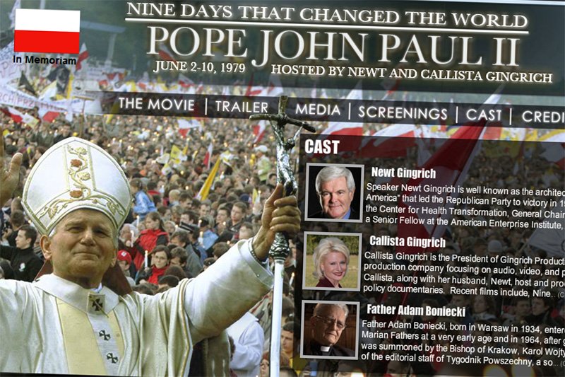 Produkcja nie mniej hołduje Janowi Pawłowi II, jak Polakom w ogóle. Wygląda zatem na to, że jeżeli to właśnie Gingrichowi przyjdzie zmierzyć się z Barackiem Obamą i być może wygrać wybory prezydenckie w USA, w Białym Domu będziemy mieli przyjaciela.