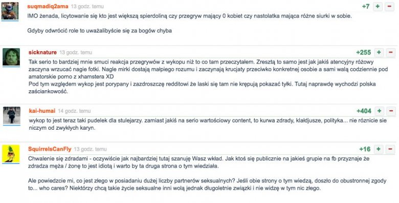 Spora część użytkowników Wykop rzecz jasna zacierała ręce czytając kolejne wrzutki udowadniające ich teorie o powszechnej rozwiązłości Polek. A pomysłodawców projektu nazywają bohaterami. Pozostali użytkownicy z dystansem i lekkim zażenowaniem przypatrywali się całej akcji i reakcji. Żart z gwałtu to przegięcieApeluję o rozwagę w całej aferze. Nie wyzywajcie tych dziewczyn, piętnujcie tylko najgorsze zachowania jak zdrady czy jakieś chore akcje.