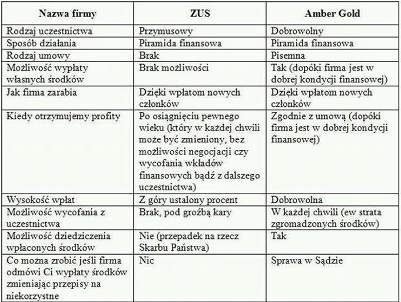 Amber Gold przy ZUS-ie wypada niczym łagodna, przyjazna klientom spółka – śmieją się internauci. W przypadku firmy Marcina Plichty "uczestnictwo" było dobrowolne, a w Zakładzie Ubezpieczeń Społecznych jest przymusowe. Poza tym obydwie "firmy" zarabiają dzięki wpłatom nowych członków. W Amber Gold, dopóki spółka była w dobrej kondycji, można było wypłacić zainwestowane środki, a w ZUS-ie nie ma takiej możliwości.
