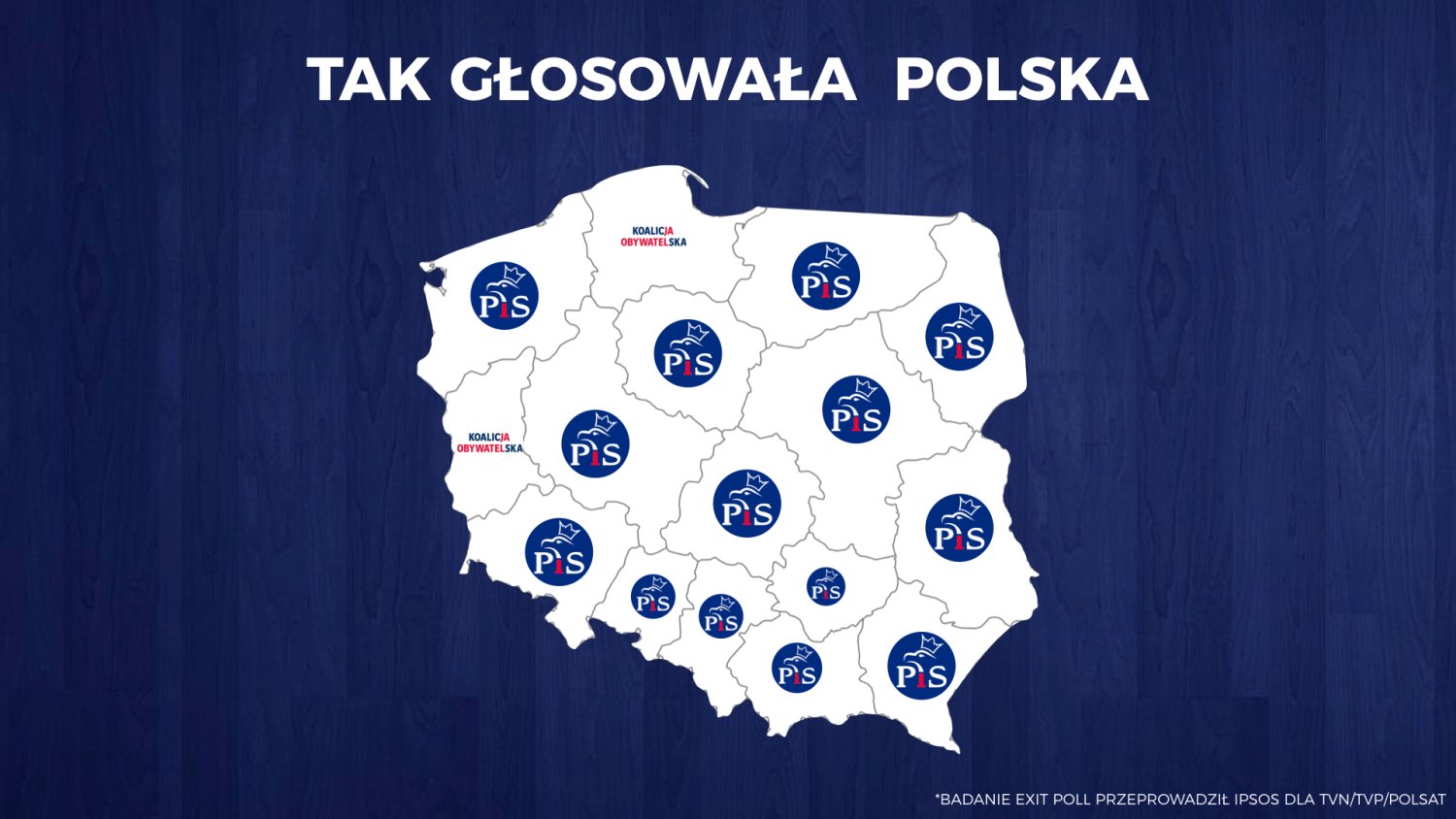 Według sondażu exit poll Prawo i Sprawiedliwość zdobyło w wyborach parlamentarnych 43,6 proc. a druga, Koalicja Obywatelska 27,4 proc. Różnica pomiędzy nimi jest znaczna, ale jeszcze dobitniej obrazuje ją sondażowy wynik w poszczególnych województwach. Tutaj wynosi ona 14 do 2.
