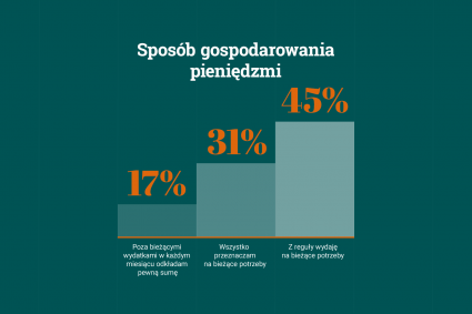 Powyższe deklaracje wypadają ciekawie w zestawieniu z odpowiedziami na bardziej szczegółowe pytania, zadane przez badaczy. Wiemy już, że do regularnego i comiesięcznego odkładania na osobne konto określonych sum przyznaje się dzisiaj 17 proc. z nas. Z kolei prawie połowa z nas (45 proc.) stwierdza, dość enigmatycznie, że “z reguły wydaje na bieżące potrzeby, ale od czasu do czasu udaje się im coś odłożyć”.