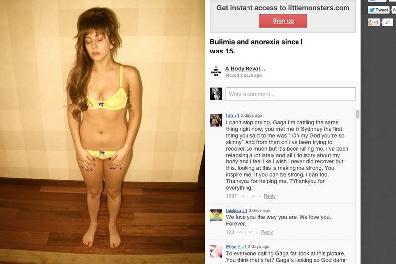 Na pierwszych stronach tabloidów i rozmaitych internetowych portali plotkarskich znalazła się ostatnio "szokująca" informacja: Lady Gaga przytyła! Gaga, zamiast kajać się i wstydzić, w odpowiedzi zamieściła w sieci swoje zdjęcia w samej bieliźnie i podpisała jej odważnym wyznaniem: Mam bulimię i anoreksję od 15 roku życia. Tym samym zaczęła kampanię mającą promować samoakceptację. Nazwała ją BODY REVOLUTION 2013.