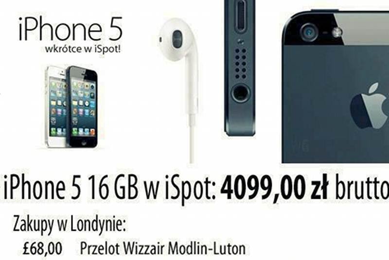 Jak czytamy, kupując telefon w Apple Store na Covent Garden w Londynie (wersja 16 GB) zapłacimy 529 funtów, a więc dużo mniej niż w Polsce. Biorąc ze sobą te cztery tysiące złotych, które przeznaczylibyśmy na iPhone'a w kraju, możemy zapłacić jeszcze za przeloty na trasie Warszawa Modlin – Luton, bilety kolejowe Luton - Londyn, bilety autobusowe na Covent Garden, przejażdżkę Londyn Eye, dwie butelki whisky, brytyjskie danie Fish & chips, bilet wstępu do gabinetu figur oraz przejazdy taksówką z lotniska do Warszawy.