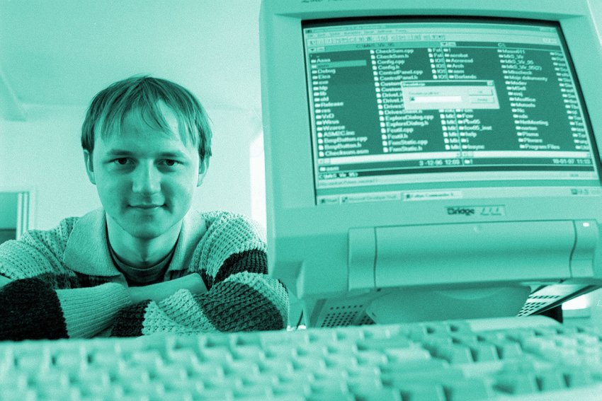 Łukasz Foltyn w latach 90. i stworzony przez niego program do zarządzania plikami – Foltyn Commander. (Fot. Robert Kowalewski / Agencja Gazeta)