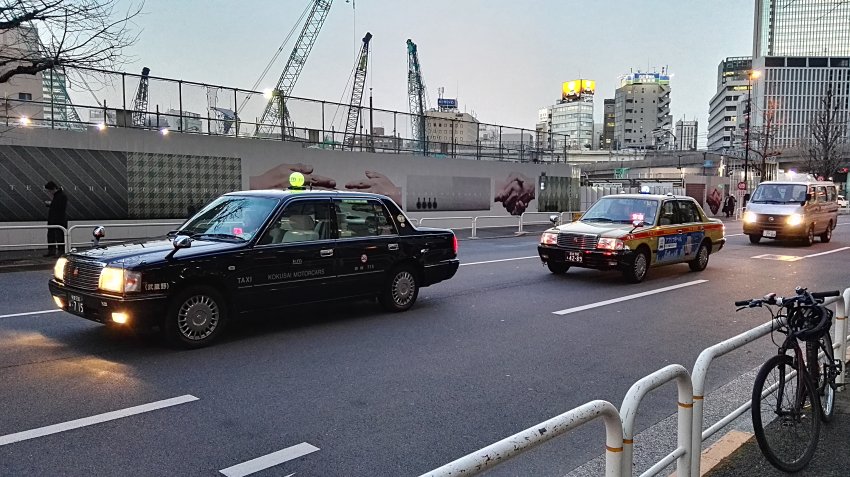 Mocno tradycyjne taksówki stoją lekko w kontrze do nowoczesnego Tokio. Mimo to, pasują.