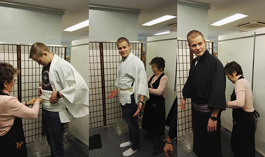 Pod kimonem nie powinno nosić się ubrań, ale przez pogodę dostaliśmy taryfę ulgową.