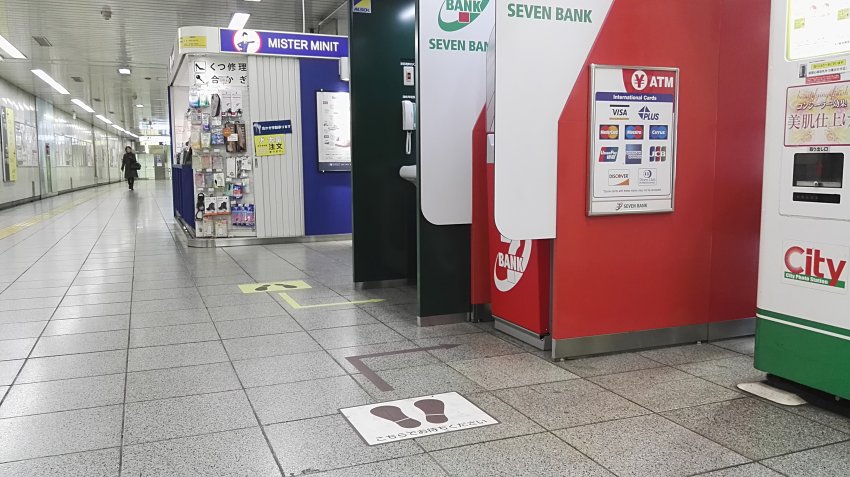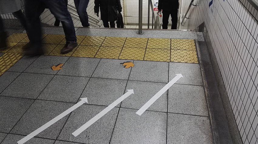 To jeden wielki labirynt strzałek, kropek, linii, kolejek. Do końca życia zapamiętam, że w Japonii po schodach chodzi się lewą stroną. LEWĄ, NIE PRAWĄ! Jeśli nie zwrócisz na to uwagi przez pierwsze kilkadziesiąt kroków, nie martw się, szybko przypomną ci o tym następne strzałki, znaczki i informacje. Lewą w górę, prawą w dół. Lewą w górę, prawą w dół - wchodząc po schodach widziałem to non stop. Doszło do absurdu, że w jednym miejscu nalepiono nawet... kropki, które pokazywały, jak wchodzić po schodach.