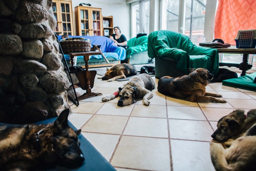 W mieście z tym zwierzyńcem nie dało się mieszkać. Założycielka fundacji “Chata Zwierzaka” podjęła więc decyzję o wyprowadzce pod Warszawę. Od prawie pięciu lat wynajmuje dom pod Serockiem, gdzie na 250 metrach kwadratowych mieszka ze swoimi podopiecznymi. W tej chwili jest to 40 psów i 57 kotów, ale liczba jest płynna, w każdej chwili może przybyć nowy podopieczny, czasem zdarza się, że któregoś ubędzie. Dom otacza spora działka, gdzie każdy pies może wyjść i wybiegać się.