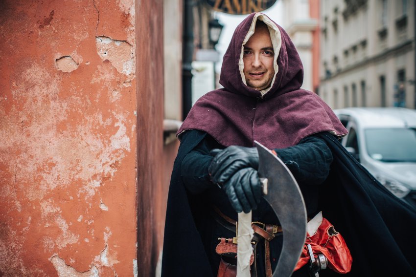 Na warszawskiej Starówce dostrzegamy mężczyznę w katowskim przebraniu, który stoi na szeroko rozstawionych nogach trzymając w ręce topór. Trudno go nie zauważyć. Okazuje się, że za jego niezwykłym zawodem kryje się... inny niezwykły zawód.
