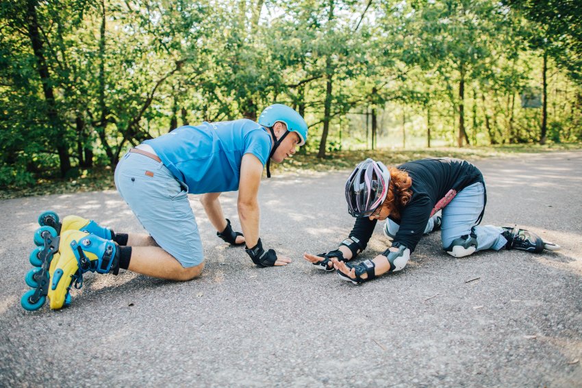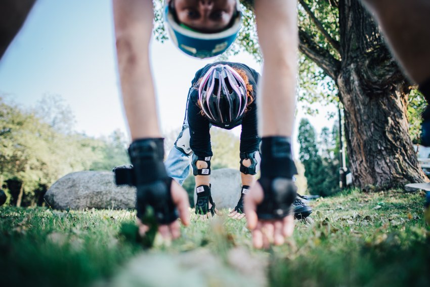 Okazuje się, że przy upadku zasada numer 1 to zejść jak najniżej zanim stracimy kontrolę. Jeśli upadamy do przodu, trzeba pojechać na ochraniaczach dłoni wyginając jednocześnie palce do góry. One nie są osłonięte, więc ten ruch chroni je przed otarciem, a nawet bolesnym zdarciem skóry.