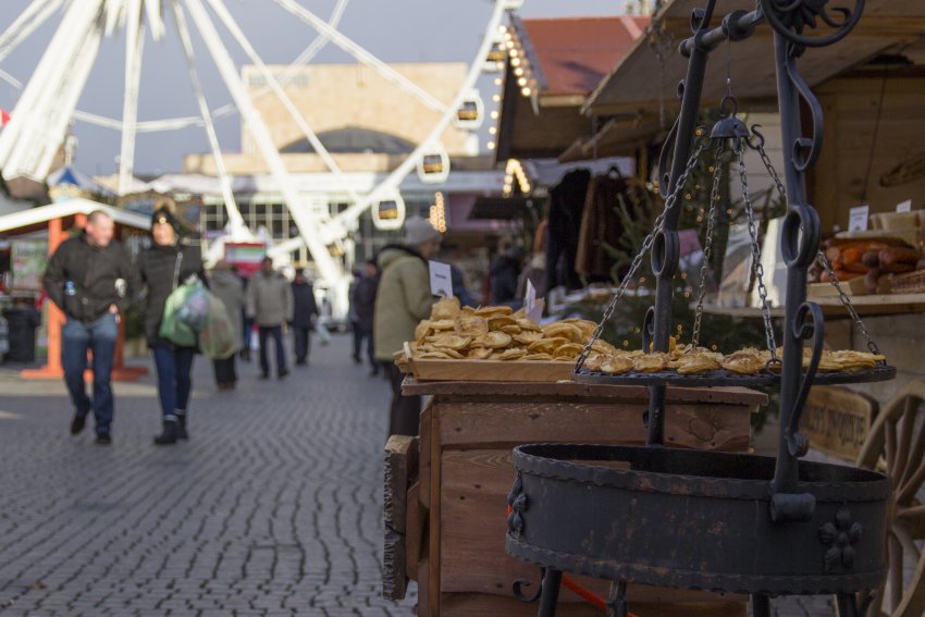 Mając w zapasie jeszcze kilka godzin, postanawiamy zwiedzić jarmark wzdłuż i wszerz. Mijamy odświętnie udekorowane „domki”, które kuszą kolorowymi towarami. Ozdoby choinkowe, artystyczna biżuteria i ceramika, zabawki, wełniane skarpetki, ręcznie wykonane czapki, szaliki, maskotki – jest w czym przebierać w poszukiwaniu gwiazdkowych prezentów, dekoracji czy elementów garderoby.