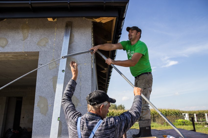 – Dziadek, podaj młotek – Marek Delegacz woła z niskiego rusztowania do swojego pomocnika. “Dziadek” okazuje się jego wujkiem, ale na budowie ochrzczony został tym pseudonimem. Montują piorunochron na niedokończonym jeszcze domu. – Tutaj taka... naturalna wieś, że chciałem zabezpieczyć się na wypadek burzy – tłumaczy Marek.