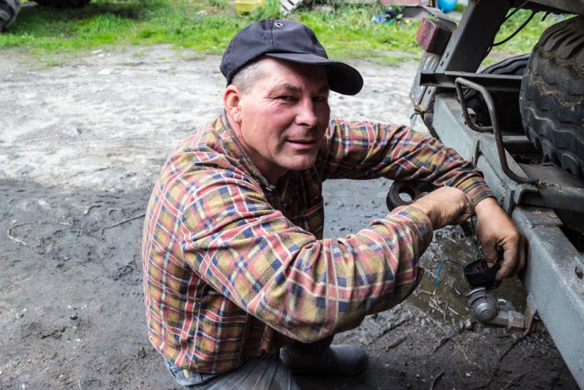 Razem z synem naprawiają kierunkowskaz przyczepy. Jego syn związał przyszłość z rolnictwem, zaczął studia w tym kierunku. Tacy jak oni stracą najwięcej ziemi.