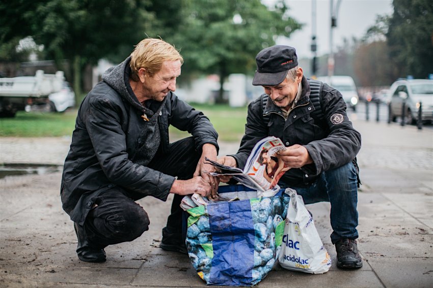 Po chwili nadchodzą kolejni klienci skupu. To 55-letni Grzegorz i o 2 lata młodszy Piotr. We dwójkę niosą torbę po brzegi wypchaną czasopismami. Na oko wyliczają, że będzie 15 kilo. Na skupie płacą 35 groszy od kilograma, czyli wyjdzie 5,25. Również niosą makulaturę z hasioków, czyli śmietników. Sugeruję, że wykonują pożyteczną pracę na rzecz miasta – No tak, sprzątamy na terenie.
