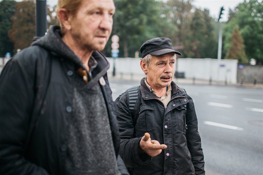 Gdyby tu pod drzewem leżała puszka to bym ją podniósł – zapewnia Piotr. Obaj są bezdomnymi. – Mieszkamy pod chmurką – przyznaje Piotr. – Sąd mnie podpuścił. Załamałem się psychicznie. Straciłem dom, pracę. A że ze zdrowiem mam kiepsko, to i do pracy się nie nadaję. Teraz jakoś sobie radzę – mówi 53-latek. – A ja sobie zrobiłem urlop na całe lato i w poniedziałek idę do normalnej pracy – dodaje Grzegorz i żałuje, że nie szli z wózkiem, mówią na to “z dzieciakiem” – to by było fajniejsze do pokazania.
