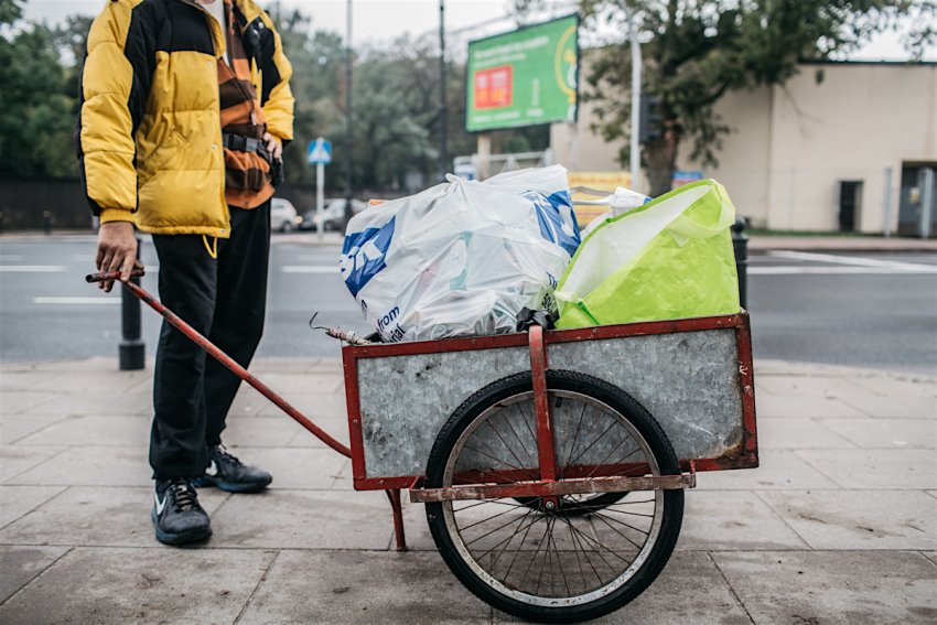 Książki są lepsze do zbierania niż gazety: zajmują stosunkowo mało miejsca, a swoje ważą. Niektórzy nie mają wyjścia i tylko takie rzeczy są w stanie targać ze sobą. – Za kilogram puszek, czyli tak 50 parę, są cztery złote. Ale to trzeba je pognieść, a ja mam chory kręgosłup – wyjaśnia starsza kobieta.