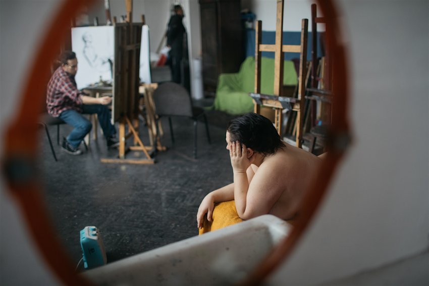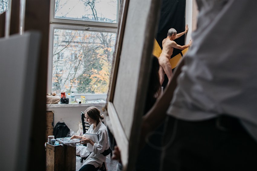 Otwierają się drzwi do pracowni. – Proszę przejść dalej, bo na korytarzu omawiamy prace – mówi jeden z prowadzących zajęcia. Jego student ustawia obrazy pod ścianą. To pierwszoroczny adept malarstwa. Prowadzący dłuższą chwilę przygląda się pracom. – Powiedz mi kilka słów o sobie? Co cię tutaj sprowadziło? – zaskakuje żaka nieoczekiwanym pytaniem. – Studenci pierwszego roku mają większy problem z nagim ciałem. Nie wiedzą jak reagować. Starsi studenci podchodzą już z pełnym profesjonalizmem – wracamy z modelem Adamem do rozmowy.