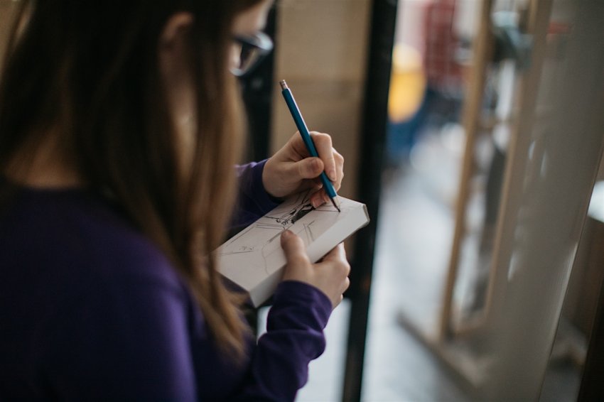 Student Staś kończy szkic, do którego pozowała Adrianna. Siedziała na krześle z podkurczoną nogą. – Kiedyś rysowałem modela Grzesia. On się ciągle ruszał – śmieje się Stasiu. Na szkicu odzwierciedlił sylwetkę modelki od przodu. – Ale koledzy to robią piękne rzeczy – pokazuje prace innych studentów z grupy. Ta sama modelka, ale ujęcie sylwetki i wykonanie zupełnie inne.