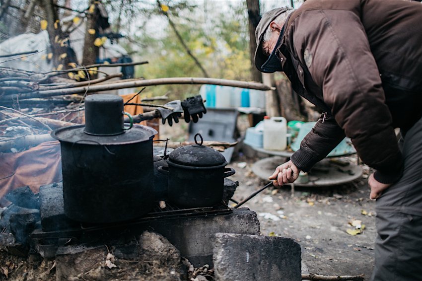 Zima to najgorszy czas nie tylko z powodu mrozu. Gorzej wtedy o puszki, bo mniej młodych pijących po parkach.– O, tam w Bieszczadach dopiero mają biedę – pokazuje na obrazek gór wiszący na drzewie. Dzisiaj Maniek wrócił zadowolony. Znajoma sklepowa zostawiła dla niego trochę mięsa. Rozpala ognisko. Palenisko zrobione jest z kunsztem, betonowe bloki obsypano piaskiem. Podnosi pokrywkę garnka. – Będzie golonka – wyjaśnia.