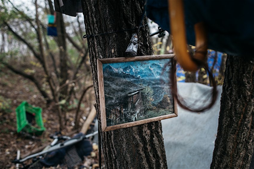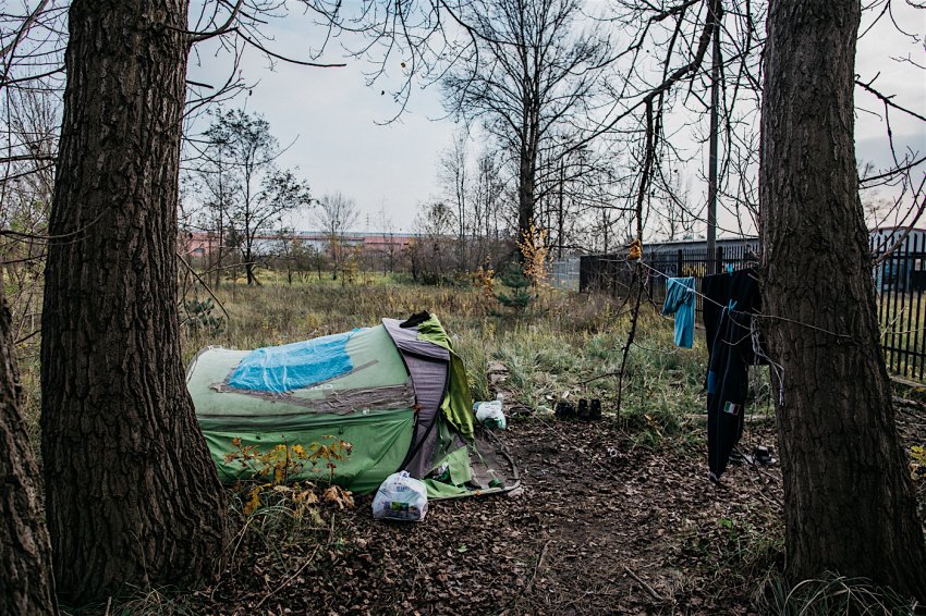 Ich namiot stoi daleko od reszty koczowiska bezdomnych. Rozbili go wśród drzew w pobliżu kanału Żerańskiego. Najbliżej nich, w krzakach, żyją Ukraińcy. – Są teraz w pracy – dodaje Andrzej.