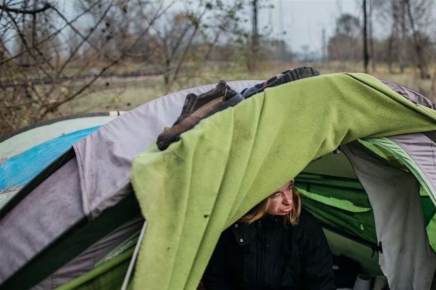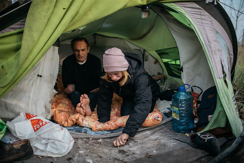 Namiot tej pary bezdomnych stoi po środku niczego.