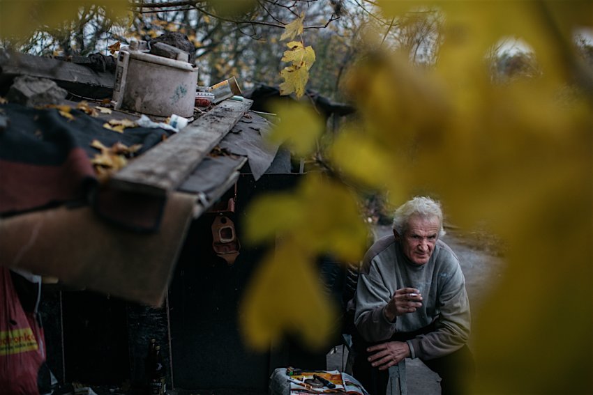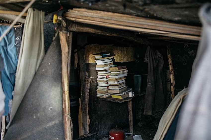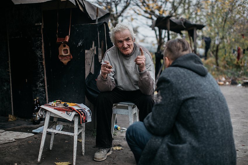 – Ale po co? Ja wolę być głupi – Andrzej odpowiada na pytanie, czy chciałby powrócić do normalnego życia i świata. Stworzył swój na koczowisku na Żeraniu. Jego zrobiona z płyt buda stoi w zagięciu rur ciepłowniczych. Drzewo nad nią się zażółciło. Buda zrobiona jest solidnie. Obita wykładzina, a w środku ocieplona tekturą. Z przedsionka wchodzi się do “sypialni”. Trzeba się mocno schylić, aby wejść do środka. Andrzej zadbał też o palenisko. Osłonił je daszkiem przed deszczem. Nawet wykopał rowek, który odprowadza deszczówkę. Mówi jakby cytatami z gazet. Sporo ich leży pod daszkiem budy. Jest też stosik książek. Andrzej twierdzi, że nie czyta, tylko ktoś mu je podrzucił.