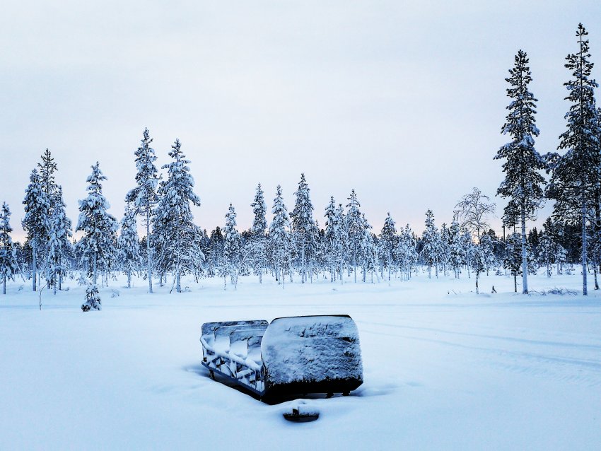 Już sama droga z Rovaniemi na miejsce była ciekawym przeżyciem, bo gdyby kierowca autobusu korzystał z nawigacji, usłyszałby pewnie tylko: za lotniskiem w prawo, a potem 170 kilometrów prosto. Ale to nie było „prosto”, do jakiego jesteśmy przyzwyczajeni. To 1,5 godziny jazdy po ciemku przez totalnie zaśnieżony las co jakiś czas przerywany domkami pośrodku niczego (co ciekawe, każdy już świątecznie przystrojony) lub malutkimi miejscowościami. Wszyscy jeżdżą tam na kolcach, nawet kierowcy dużych autobusów.