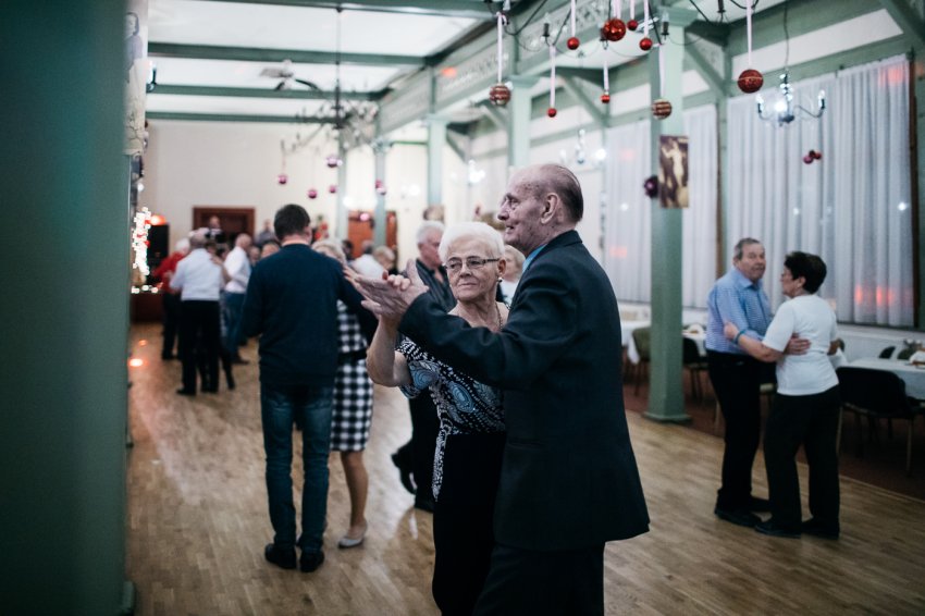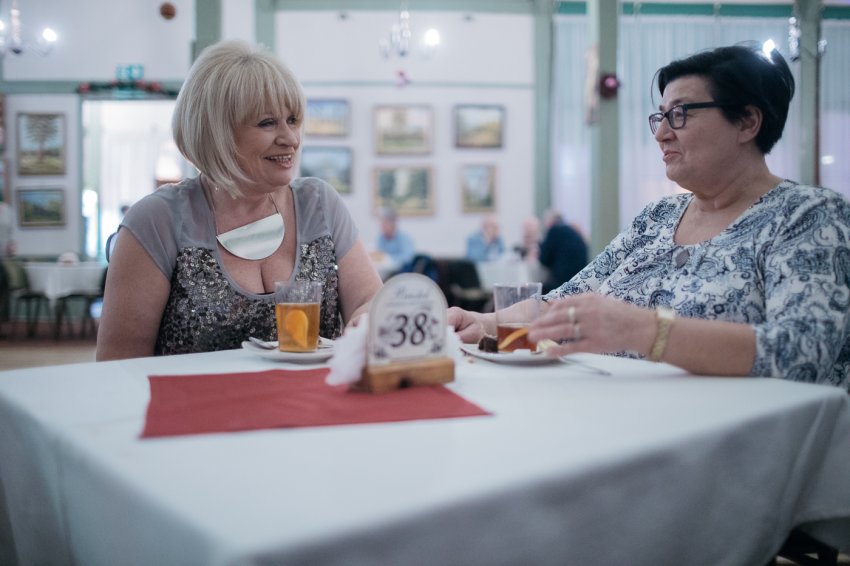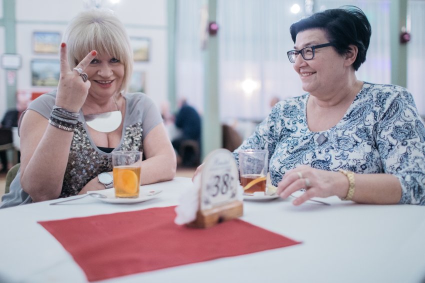 Jesteśmy po 14:00. A w środku już jest tłoczno. Większość kuracjuszy siedzi przy okrągłych stolikach. Niektórzy posilają się obiadem, inni rozgrzewają herbatą, a jeszcze inni – dodają sobie odwagi alkoholem. Wszyscy czekają na muzykę na żywo, niektórzy samotnie. Piosenki lecą tu trójkami: wolna, szybka i do pobujania się. Potem chwila na przekąskę, znalezienie partnera i znów w tany.