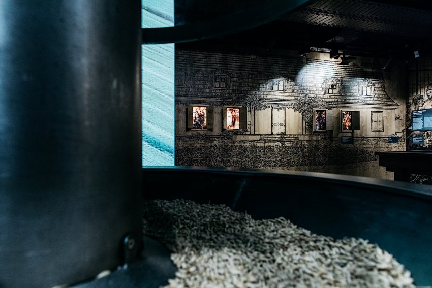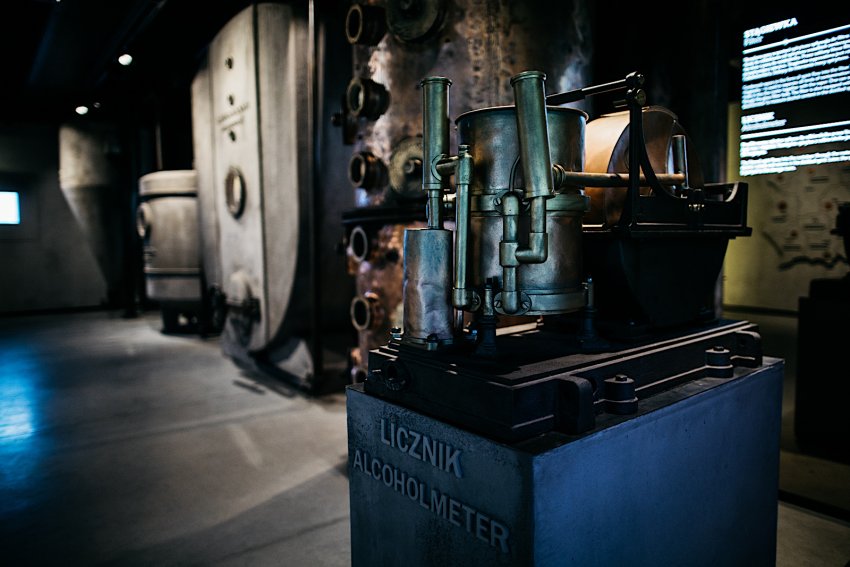 Podłoga w niektórych pomieszczeniach wyłożona jest drewnianymi panelami. Niby nic nadzwyczajnego, tyle tylko, że pochodzą z oryginalnych beczek, w którychś kiedyś trzymano wódkę i ktoś się musiał nieźle napracować, by je wyprostować. W sali kinowej siedzimy z kolei na fotelach pochodzących z warszawskiego teatru “Komedia”. Są też zrekonstruowane machiny, jak parnik, kadź zacierna i fermentacyjna oraz licznik, stągiew i kolumna destylacyjna pochodzące z prawdziwych gorzelni.