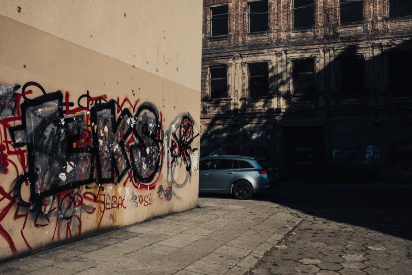 Wystarczy zasłonić graffiti, przeparkować samochody i wszystko wygląda tak, jak w czasie wojny. Fot. Maciej Stanik